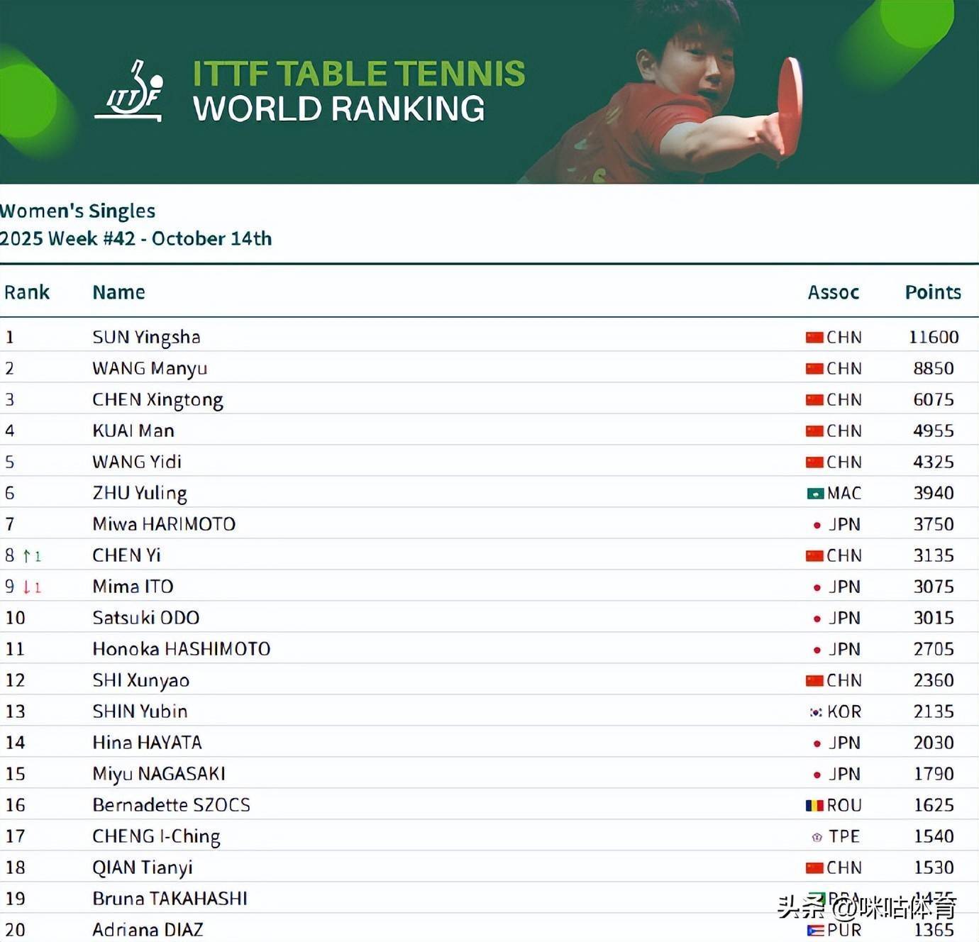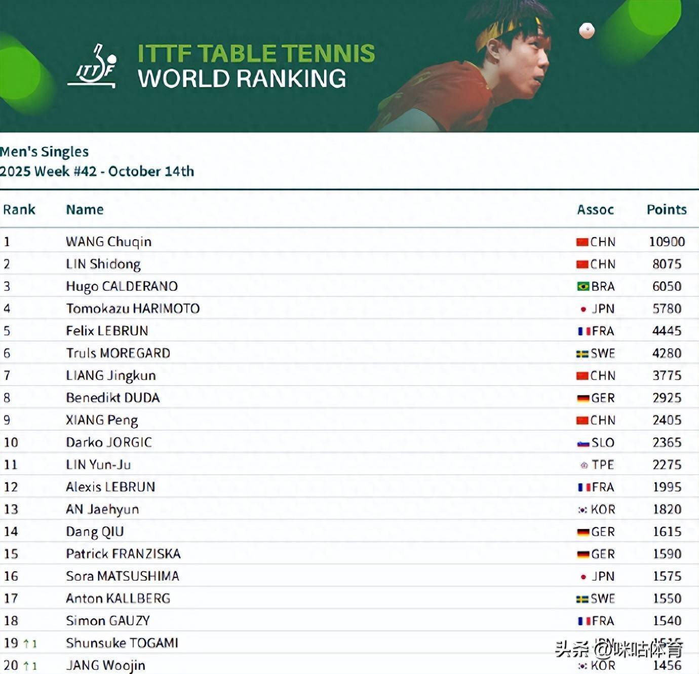 10月14日,2025海外乒联第42周名次出炉,王楚钦和孙颖莎位列男单和女单第一! 具体名次如下: 男单:王楚钦10900分、林诗栋位列前二,梁靖崑位列第7,向鹏位列第9 女单:孙颖莎11600分、王曼昱、陈幸同、蒯曼、王艺迪位列前五,陈熠第8男双:王楚钦/林诗栋第4、林诗栋/黄友政第10女双:王曼昱/蒯曼第一、孙颖莎/王曼昱第四、蒯曼/王艺迪第7、孙颖莎/王艺迪第11混双:林诗栋/蒯曼第1、王楚钦/孙颖莎第3、黄友政/陈熠第10![]() ","del":0,"gnid":"9a8a7882cad555cde","img_data":[{"flag":"2","img":[{"desc":"","height":"1330","title":"","url":"http://p9.img.360kuai.com/t11508c75c8df8aa70f16752beb.jpg","width":"1380"},{"desc":"","height":"1328","title":"","url":"http://p9.img.360kuai.com/t11508c75c8d224f2145c5ae9c9.jpg","width":"1380"}]}],"original":0,"pat":"pdc,art_src_3,fts0,sts0","powerby":"cache","pub_time":1760405040000,"pure":"","rawurl":"http://zm.news.so.com/9fac4691d198b5aeb5c2e42b20fc45aa","redirect":0,"rptid":"9063065abee3dcb0","rss_ext":[],"s":"t","src":"咪咕赛事","tag":[{"clk":"ksport_1:王曼昱","k":"王曼昱","u":""},{"clk":"ksport_1:王楚钦","k":"王楚钦","u":""},{"clk":"ksport_1:王艺迪","k":"王艺迪","u":""},{"clk":"ksport_1:孙颖莎","k":"孙颖莎","u":""},{"clk":"ksport_1:海外乒联","k":"海外乒联","u":""}],"title":"海外乒联第42周名次出炉,王楚钦和孙颖莎位列男单和女单第一!","type":"zmt","wapurl":"http://zm.news.so.com/9fac4691d198b5aeb5c2e42b20fc45aa","ytag":"体育:乒球","zmt":{"brand":{},"cert":"咪咕体育赛事官方账号","desc":"上咪咕视频,畅看男篮亚洲杯、中超、五大联赛等各大体育赛事","fans_num":0,"id":"3419072182","is_brand":"0","name":"咪咕赛事","new_verify":"5","pic":"https://p0.img.360kuai.com/t11508c75c878ac7adaa75d35dd.jpg","real":1,"textimg":"https://p9.img.360kuai.com/bl/0_3/t017c4d51e87f46986f.png","verify":"0"},"zmt_status":0}","errmsg":"","errno":0}
