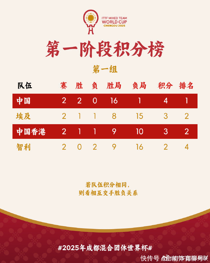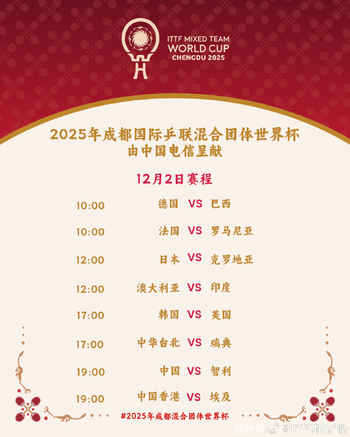 2025年景皆海外乒联搀杂团体寰球杯,是今年度终点伏击的一项赛事。中国队手脚卫冕冠军出战,日本队因为上届比赛7-8输给中国香港队无缘四强,本次比赛派出了主力威望出战。小组轮回赛第一轮,中国队与日本队皆所以8-1到手, 小组轮回赛第二轮,C组比赛成果为:韩国队8-6中国台北队、瑞典队8-0好意思国队;B组比赛成果为:日本队8-4印度队、澳大利亚队3-8克罗地亚队;D组比赛成果为:罗马尼亚队8-2巴西队、法国队4-8德国队。A组比赛成果为:中国队8-0埃及队、中国香港队8-2智利队。